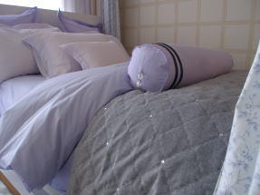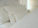 暖かい羽毛ふとんに、綿サテンのベッドリネンをおかけしております。