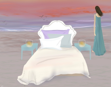 レインボーに染まる 夏の海と空 その砂浜に 白いベッドの上にパープルと ブルーグレーと白い枕。 黄昏色の染まった空気の中 ブルーグリーンのロングドレスを着た 女性がゆっくり砂浜を歩く… 「ハイ、カット!」 お疲れ様でした。 |