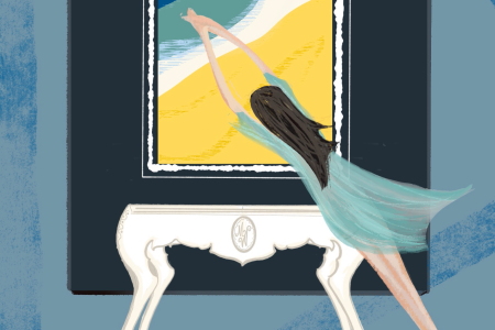 青い壁の中に 黒い壁、 その中にさらに、 海のようにも見えるモダンな絵 しかし、 その前の白いコンソールテーブルも さらに、飛び込もうとしている 女性もこれも絵? |