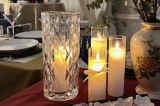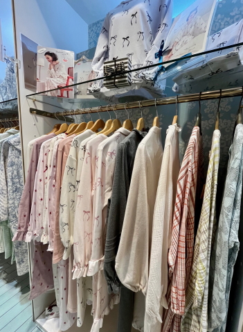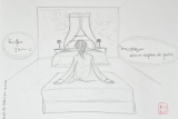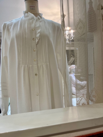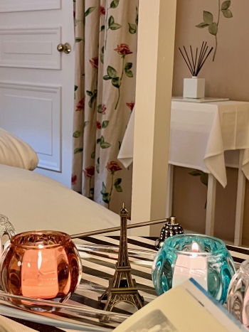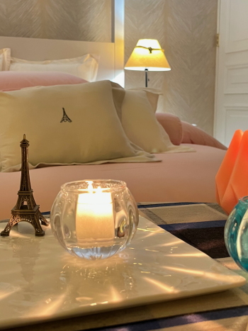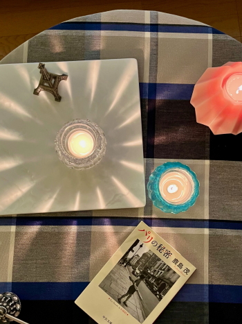 ナイトテーブル(テーブルクロスを敷いています)の上、