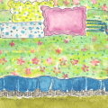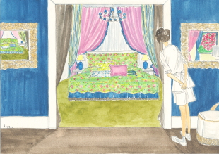 セルリアンブルーの壁と 印象的なほど鮮やかな色の寝室は 誰が眠るのでしょう? カーテンが4重にかかっています。 入り口にはドアはなくカーテンのみ。 そして、奥にはクイーンサイズのベッド。 ぼかした絵画風の花模様。 あざやかなグリーンに赤紫色の花 ちょっとハイソな感じ。 濃紺とブラウンのベッドスカートと ランプスタンドの色、壁の色が同じと いうのはちょっとラッキーな気配を 感じします。 |