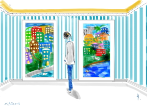 ブルーの ストライプの 壁のリビングには クローゼットの白い扉と 廊下につながる2つの 白いドアが あります。 そこには リバーサイドに ある美しい2つの街の 様子がリアルタイムで 映し出されています。 時は、 2023年。 今から5年先の未来。 ほんのドアのすぐ向こうは こんな感じです。 |