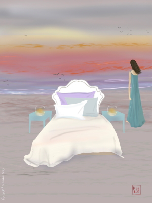 レインボーに染まる 夏の海と空 その砂浜に 白いベッドの上にパープルと ブルーグレーと白い枕。 黄昏色の染まった空気の中 ブルーグリーンのロングドレスを着た 女性がゆっくり砂浜を歩く… 「ハイ、カット!」 お疲れ様でした。 |
