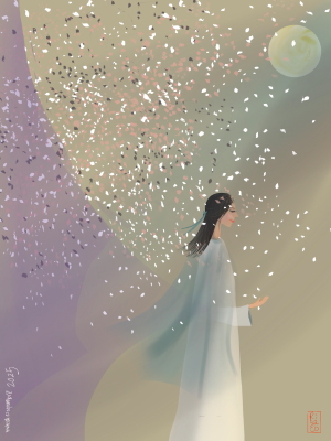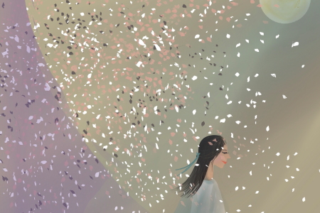 花吹雪を 浴びながら 美しい女性が 歩く満月の夜 絵になる風景 いいぇ、人生 |