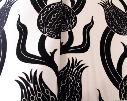 No.0331 2017年1月27日(金) こと 「大胆なデザインを部屋に取り入れたい」 ほとんど色のない部屋に どきっとするような大胆な壁紙を貼った部屋を ヨーロッパのホテルなどでよく見かけますね。 しかし、そんな大胆なデザインのクロスの中には、 写真のクロスのように日本の壁紙の基準に合わず、 貼れないものも結構あります。 紙にベルベットを吹き付けたように立体的なアートデザインは ”ペルシャンチューリップ”という名前がついていました。 手の平ほどもあるおどろおどろしいような 大きなチューリップがツルのようにつながっています。 ベースのベージュ、チューリップのワインレッドの 地味な2色使いが、強烈なインパクトを与えています。 一目で気に入て、廊下に貼りたくなったのですが、 とても残念なことにこのクロスを日本で手に入れることさえ、できないのです。 どうしても欲しければ、クロスのサンプル帖を購入して、 それを額装する方法があるなかと今、 考えているところです。 ZOFFANY persian tulip 写真、文章の無断転用はご遠慮くださいますようにお願い申し上げます。