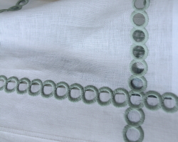 No.0332 2017年1月28日(土) こと 「好きなデザインを考えてみる」 一目ぼれしまう生地を見つけると 自分の部屋のどこかに下げられないか、 どんな風につかえばいいかといろいろと妄想してしまいます。 この一目ぼれした生地は 真っ白い麻生地に格子状に10円玉くらいの丸い穴が連続しています。 丸い穴の周りの刺繍糸の色違いがたくさんあります。 上は、ストロベリーレッド。 麻の生成り色は夏の風景には、きっと美しいでしょう。 真っ白い麻生地に白いリング模様には紺色のリボンを通してみたくなります。 こちらは、まさにティファニーブルー。 葉っぱ柄のドレープカーテンに合わせたいハーバルグリーン、 とまだまだあります。 2年前にこの丸い穴の開いた生地を選んで自宅の窓にかけた後、 ハタと気づきました。 8年ほど前に作った 丸い穴の開いた別のカーテンがあったことにです。 そして、 つまりは、私は穴あきの生地が好きだということにです。 このハーレクインのコレクションの名前を”Jardin Boheme” 「ボヘミアンな庭」と言います。 縛られない自由を表現しているのでしょうか。 ちなみに先月、オレンジ色でシェードをお作りしました。 いつかお見せしたいです。 そしてこの穴あき柄は、穴あきではなく、 ”Reverie” 夢、夢想という素敵な名前です。 生地巾132cm ¥18,600/m +税 写真、文章の無断転用はご遠慮くださいますようにお願い申し上げます。
