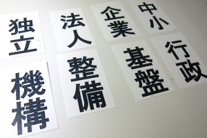 No.0387 2017年3月25日(土) こと 「硬いものの宣伝方法」 中小、行政、企業、基盤、法人、整備、独立、機構 2文字熟語の角ばった文字が8個。 これは組みあわせるとあるひとつの団体の名称になります。 さて、どう組み合わせるのでしょうか? 行政だからトップに置いて その下に画数の多い熟語を並べて、 その下にそれらより柔らかそうな熟語を並べてみるさらに 硬い印象になりそう.... さて、もうお分かりの方も多いことでしょう。 答えは、今話題の『独立行政法人中小企業基盤整備機構』 略して『中小機構』の正式名称でした。 右から読むと、なるほど、そう読めます。 流通新聞の広告欄で見つけた宣伝文句があまりに 面白くて、文字を打って印刷してカードにして並べてみたのです。 「読みにくい社名でも、企業の想いは読み取ります。」と 小さく書かれた一文に一行力がありますね。 長いなら、硬いなら、分割してみようという、 グッドな例ですね。 手ごわい仕事も分割すれば、シンプルに見えるという風にも 読めませんでしょうか? ホームページをのぞいてみたら、もっと柔らかでした。 写真、文章の無断転用はご遠慮くださいますようにお願い申し上げます。