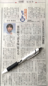No.0521 2017年8月8日(火) もの 「ジェットストリーム 驚異の電波力」 ジェットストリームと言えば、 JALがスポンサーをする有名なFMラジオ番組を 思い浮かべる方も多いのではないでしょうか? 城達也さんから今の大沢たかおさんまで、機長と呼ばれるパーソナリティが イージーリスニングのメロディーに乗せて夢の中へと誘う、 ロマンチックな音楽番組ですね。 しかし、もうひとつのジェットストリームはこちらです。 油性のボールペンなのです。 日経MJ 2017年7月31日の記事によりますと、 海外もあわせると、年間1億本以上も売れているとのこと。 そして三菱鉛筆の屋台骨になりつつあるとのことです。 開発者の市川さんのコメントを読んでいましたら そのなめらかな書き味の開発秘話がとても興味深く、 新聞にアイロンをかけて写真を撮りました。 私は本田直之さんの「レバレッジ人脈術」というほんの中で、 「世界一書きやすいボールペン」と紹介され、ご自身がハワイのご友人への お土産に大量に買い込まれるという文脈で知ったのですが、 2008年以来、愛用を続けています。 そのようなわけで、 宅配業者さんのポケットなどにこのジェットストリームを見つけると 同朋意識を感じて、その「購入経緯」を聞き出してしまいます。 今はいろいろな種類が出ているようですが、 一番安価なこのタイプはやはり、ペン差しの部分が すぐに割れてしまうのが唯一の欠点かなと 思っています。 しかし、年間、大人の日本人が 必ず1本買っているくらいに人気のボールペンと考えると、 書き味というものはネーミングのごとく、 驚異の「伝播力」ならぬ、「電波力」ですね。 お問い合わせなどはこちらからどうぞ。 ontact us