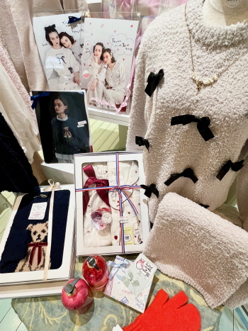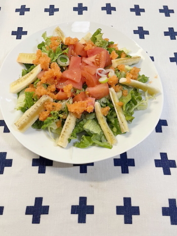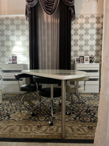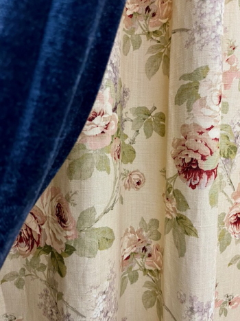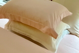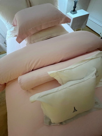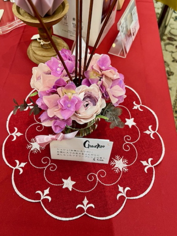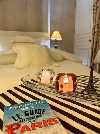 ナイトテーブル(テーブルクロスを敷いています)の上、