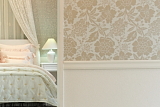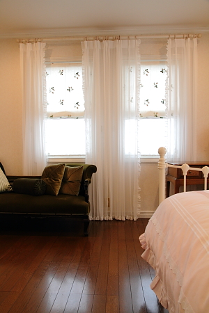 「ワーズワースの前庭」へようこそ。 2015年9月20日(木) 第8回 Room No.0008 「マナーハウスへようこそ」 第1部 涼しい風も少し肌寒く感じられるすばらしい秋がやってまいりました。 さて、みなさまお元気で素敵な日々をお過ごしでしょうか? さて、ここは、シャンデリアと白いブラインドが下がる幅約2.8mの部屋です。 ここを ワーズワースの前庭チームによる素晴らしいパフォーマンスで 美しいマナーハウスのベッドルームに変えてお見せしようとわくわくしているのです。 本日はその第1部ございます。 それでは早速、スタートいたしましょう! 幅2.8mと言えば、 京間、中京間、江戸間と多少違いがありますが、 6畳のお部屋の短い方の一辺の近似値です。 この2.8mを背にして、セミダブルのベッドをその中心に置きます。 実はこれがゴールデンバランスなのです。 左右に80cmの余裕ができます。これが一般の家屋のドアのサイズに近い幅ですから 人が余裕をもって通れるサイズ、つまりベッドメイキングをするにも 余裕のサイズというわけです。 ここにキングサイズのベッド、幅180cmを置こうとすれば、 左右50cmの余裕。そしてハリウッドキング200cmなら、 左右40cmとだんだんと狭く厳しくなってまいります。 しかし、ポイントはベッドの左右に必ず余裕を設けるということです。 さて、ワーズワースの前庭チームのバトラー氏が手に何かを持って登場です。 さて、何から始まるのでしょうか? なるほど、ベッドの背後の白いブラインドの手前に レースカーテンを掛けるつもりのようですね。 両開きのカーテンを掛ける際のポイントは中心のマグネットから 掛け始めるということです。 その理由は最後でわかります。 あまり過ぎたランナーを左右の端にヒダとヒダの間に隠しておく こともできるからです。中心あたりでランナーががあまったら カーテンを開け閉めする度、あまり過ぎたランナーを引きずることになるからです。 「う~ん、わかるような、わからないような」でしょうか? この辺はちゃんとしたプロに任せた方が美しいカーテン掛けになります。 たかがカーテン掛け、されどというところがたくさんあるのが 窓装飾、そしてレール取り付けなのです。 さらに、左手の出入口にも素敵なレースカーテンで 間仕切りをしてみましょう。 バトラー氏は意欲満々でレースカーテンを持って直立態勢です。 脚立を動かして、さて、レールにかけます。 こうしてみると、この部屋のカーテンレールは手を伸ばしても掛けられない位置から 下がっていることがお分かりでしょう。 そうなのです。 美男子の条件にバトラー氏のように足長という要素があるとしたら、 カーテンにもやはり足長という要素があります。 天井に近い位置から下がっているカーテンなら、 美しいことはまず間違いないでしょう。 それにはまず、諸条件が必要になります。 エアコン、下地、梁のでっぱり、段差による問題などなど。 特に複数のレールの取り付けはそんな難題との終わりなき戦いなのです。 さて、次にバトラー氏、花柄のカーテンを手前に持って直立しております。 ブラインドの手前のレールにかけようという算段のようです。 さっさと素早い動作でどんどん掛けてゆきます。 両開きのカーテンのかけ方のポイント、中心から掛けるを 押さえたら、ヒダを飛ばさないように気を付けながら一つ一つランナーの リングに掛けてゆきます。 このドレープカーテンにはストロングフックという金属製のフックが ついているようです。 プラスチックフックのように丈の微調整はできませんが、 その名の通りストロングなので重たいカーテンに向きます。 白い空に映える黄色いローズとライラック。 香りまで伝わってくるようなすがすがしいイングリッシュガーデンの カーテンですね~。さらに奥にはチュールレース。 美しいコンビネーションです。 カーテンの合わせ部分には、タテ一列に半円を描くスカラップ。 なんとエレガントで美しいことでしょう! さらにお次はバトラー氏、何でしょうか? 今度はどこに取り付けようというのでしょうか? はい。正面のカーテンのさらに手前で、3つ目のレールにです。 飾りカーテン用のレールにカーテンを取り付けようとしているようです。 バランスレールといいます。 一番最後に取り付けるこのような短いデコレーションカーテンを 「バランスカーテン」、別名、「上飾り」とも言います。 これはまだ取り付ける前の段階です。 段差のある天井の下から薄いレールがついているのがおわかりでしょうか? ここにマジックテープのオスがついた薄いレールが取り付けられているのです。 そして、バランスカーテンのギャザー部分の裏にはメスのマジックテープがついています。 つまりお互い引き合うということですね。 簡単にくっつき、簡単に外れます。 まさにテレビドラマの男女のようですね。 はい。きれいに張り付いたようです。 しかし、まだ実は微調整があるようですね。 そうなのです。