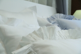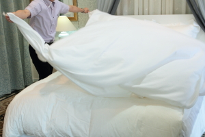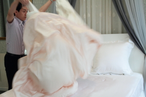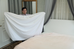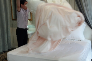 「ワーズワースの前庭」へようこそ。 2015年8月30日(日) 第6回 Room No.0006 センチメンタル・ステーション・ホテルの舞台裏にて 長い残暑の日々、きっとお疲れでいらっしゃいますよね? ここにお越しくださったということは、 きっと、そうでしょう。 あらためまして、こんにちは。 本日もご案内をさせて頂きますのは、「ワーズワースの前庭」のバトラーのKと申します。 それでは、わざわざお越しくださったあなたさまに 夏のお疲れを癒すとっておきの対処法をお教えいたしましょう。 それは「ベッドリネンを替える」という実に簡単な対処法です。 今日は、「シャンパーニュ」、別名「そめいよしの」という 魅惑のピンキッシュオレンジのベッドリネンから 癒し効果抜群の色、スノーホワイトに交換してみようと思います。 それでは、まずはシーツから。 ヘッド側の方向からシーツをかけてゆきます。 両角に両手を入れて角を確認いたします。 シーツをかけ始めても、 上のおふとんはそそまま2つ折りにしておき、移動しながらのメイキングでもOKです。 お部屋のスペースに余裕があれば、おふとんや枕をオットマンやテーブルの上などに 避難させて頂ければメイキングはさらにスムーズです。 クイックシーツはゴムの力でメイキングを簡単に美しくする とても重宝なシーツですね。 フラットシーツに慣れておられないなら、このクイックシーツを おすすめ致します。 きちっと押し込めば、この通りきれいにおさまります。 ヘッドボードのすぐ手前には、スノーホワイトにお着替えを 済ませましたリラクシングピローを置いておきます。 大きな背もたれの枕はいち早くセットしておくと置き場に困りませんね。 それでは、おふとんのお着替えに参ります。 まずはコンフォーターケース(おふとんカバー)を外すことからお見せいたしましょう。 そして今回はちょっとマル秘の技を使います。 ファスナー側から手を入れて、 おふとんカバーとおふとんをつないでいるひもを全部外してしまいます。 ひもは結ぶのは難しくても外すのは簡単です。 ベッドメイキングがおっくうと言われる方の多くはおふとんカバーのお着替えが 面倒と言われますようです。 それなら、まずはテンポのよいジャズやポップスをかけて、リズミカルに ダンスでもするような気分でスタートしませんか? それではゆきますよ!手前のおふとんを引っ張る要領で、 「えいやっ!」の気持ちで持ち上げます。 でも実は、 「フランソワーズ・アルディ~」と叫んでいま~す。 でも、今の気分は「ジェーン・バーキ~ン」 羽毛ふとんとはこんなにも飛び上がるものなのです。 そして、「ZAZ、ジュテ~ム~!」 はい、見事着地致しました。 「ほ~、きもちい~」 それでは、冷静になって、おふとんを平たく整えます。 スノーホワイトのおふとんカバーをかけ始めましょう! まずは、タテ、ヨコの方向の確認です。 ダブルサイズのおふとんは特に方向を間違いやすいので要注意です。 ファスナーの位置がヨコ方向に来るようにして、 ファスナーから中に手を入れたら、奥の両角をつかんでくださいますように。 しっかりと! そして大きく手を広げるように、鳥が羽ばたくように、 一気に広げま~す。 おふとんの上にきれいに広げたら、全部のひもを結びます。 そして今度は裏返したコンフォーターケースを表にひっくり返しますよ。 前と同じ要領でファスナーから手を入れて、反対側のおふとんの両角をしっかりつかみます。 「フランソワーズ・アルディ~!」と叫び、 「ZAZ~」と華麗に舞い、 「ジェーン・バーキ~ン!」 と着地させました。 はい。見事に着地成功です。 襟元を折り返すのは、「いつもでお休みください」という 就寝準備、ターンダウンです。 今回は、スノーホワイにフリルつきのブルー・アジュールのリラクシングピローと ブレックファストピローを足して、ブルー&ホワイトのベッドルームに しつらえました。 そして頭の上から下がる天蓋カーテンは 3色のグレイッシュなシフォンレースです。 手前に行くほど濃くなっているのがお分かりでしょう。 それでは、ノーブルなホワイトベッドで どうか、癒しのひと時をご堪能くださいますように。 私はお邪魔でしょうから、これにて失礼いたします。 それでは、次回もどうか、お楽しみになさってくださいますように。 「ほ~、いい汗かきました~」 お問い合わせは、こちらから ontact us 写真、文章の無断転用はご遠慮くださいますようにお願い申し上げます。