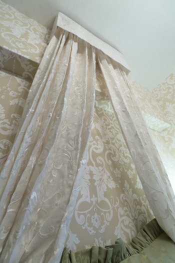 Room No.0159 2022年9月15日 (木) 「オテル・ド・Madame K」 K様邸のスイートから 「お元気ですか? 私は今、私の双子の姉妹の出来立てのベッドルームから このメッセージを書いています。 なんて言ったらびっくりするかな? もちろん血はつながってはいないけど、 私たち友人同士はよく二卵性双生児みたいって言われるのよ。 だって、小学生からずっとずっと仲良しで、 何でも相談し合える仲なんて兄弟姉妹だってなかなかいないでしょ? お互い、すごいって思うわ。 この部屋だって、私たちが一緒になって あーでもない、こーでもないってずっとずっと、 考えて、考えて、考え抜いた末に完成したお部屋なんだもの。 腰壁のデザインから、壁紙、カーテン、 スイッチプレート一つだってね。 このこげ茶色の格子の内窓を提案したのは私なの。 (ちょっと自慢) そこに斜め格子のレースと抹茶グリーンのダマスク柄のシェードを下げたら、 こんなにクラシカルでロマンチックな窓辺になったのよ。 かわいいボンボンのフレンジも効いているでしょ? 実は、私、完成したこのクラシカルなお部屋を見た時、 パッと思い浮かんだシーンがあるの。 ダマスクの壁に天井から下がる ダマスク刺繍レースの天蓋カーテンでしょ、 そして、 お揃いのベッドスプレッドと、ブレックファストピロー、 クローゼットとの間仕切りも 窓のシェードともお揃い、 ちゃんと脇にはボンボンのトリムがあるでしょ? そうなの、 このベッドに横になって目を閉じると、 パリのコンコルド広場の 由緒あるホテルにいる気分になるのよ。 ほら、 なんて美しくて、なんて優美なんでしょ~! そう、 コンコルド広場のオテル・ド・クリヨンのあるシーンなのよ。 クリヨンが舞台になった映画や小説は たくさんあるでしょうけれど、 この部屋で、 ヘミングウェイの『陽はまた昇る』の主人公の気持ちになれたのよ。 彼はオテル・ド・クリヨンで女性が来るまで、 ラウンジに座って2、3通の手紙を書くの。 なぜかって、 クリヨンで手紙をしたためると なんだかすごく高級な、いい気分だったからなのよ。 だから、ここは まさしく、『オテル・ド・Madame K』のスイート この気持ち、わかるかしら? きっと、わかるわよね。」 K様、N様、 姉妹関係を越えた、稀にみる息の合ったコンビネーション、 そして コミュニケーションのおかげで こんなに素敵なベッドルーム、 "オテル・ド・Madame K" 完成しましたね。 こんなお部屋でしたためる手紙は ロマンチックでおしゃれな文章になることでしょうね。 またお目にかかれることがとても楽しみです。
