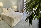Room No.0170 2024年3月22日 (金) 「季節ごとに香るベッドルーム」 S様邸ゲストルーム 2021年の春、まだコロナの真っ最中に S様邸のゲストルームのベッドの設置に伺いました。 11畳ほどの縦長のお部屋の奥にリシュリューベッドと ナイトテーブルを置き、 ベッドスカートを履かせて、 さて、メイキングです。 ブルー、グリーンの南国の花々が咲き乱れる ベッドスプレッドとお揃いの リラクシングピローでメイキングすると、 瞬く間に すがすがしいリゾートスタイルのベッドルームに なりました。 それから、翌々年の2023年の冬、 もっとリラックスできるスペースにするために、 ソファとオットマンを持って来て、 それに、すっぽりかぶせるカバーリングで あたたかな雰囲気に衣替えいたしました。 生地の中の花とはいえ、 花の力はすごいですね。 まるでゴーギャンか、マティスの絵画の中に 入り込んだようなアートな雰囲気にうっとり… タヒチアンリゾートスタイルに変身です。 さらに、今年3月、 ”パリ2024”、オリンピック、パラリンピックの、 フランス国旗のカラーリング、 ブルー、ブラン、ルージュのトリコロールのストライプ生地で ベッド回り、ソファカバーを夏スタイルに変身すると、 ニースかモナコのビーチリゾートのような 雰囲気に大変身しました。 そこにアンティークのダイニングテーブルセットを置くと、 いかがでしょう? どう見ても、フレンチなカフェ&スイート 静かな音楽を聴きながら、コーヒーを片手に読書、 そして時折、ベッドルームとお庭を眺める…。 なんともうらやましいセッティングです。 S様邸のゲストルームは アレンジができるファブリックで 四季を感じながら、ずっと飽きずに楽しめる ベッドルームのすばらしいお手本となりました。 季節の香るホテルスイート、 このお部屋のゲストになりたいものです。 ではまた次回をお楽しみに!