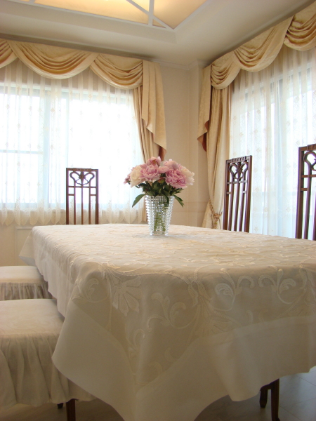 Room No.0172 2025年9月12日 (金) 「パリのアパルトマン風 アートなリビング」 T様邸 T様邸は高台の見晴らしのいい場所にありました。 お部屋に入って、 まず目を惹いたのが、このアートです。 見たことがある、ある、と思って、 調べてみたら、 ピカソの若者の輪 (La Rondo de La Jeuness)でした。 人々が輪になって手をつなぎ、楽しそうに踊り、 平和の象徴、鳩が輪の中心でひもを引いているようです。 優しさとエネルギーを感じます。 二間繋がったような広いリビングの 新たなカーテンに、T様が選ばれた生地は ピカソの絵のように、アイボリーホワイトの 光沢のあるシャンタンの上で、 刺繍の花々が繋がってダンスをしているような、 そんなデザインでした。 コーディネートレースは、とろんとして、 柔らかいシュリンクのかかかった素材。 ドレープカーテンと同じようにやさしい花の刺繡が 広がっています。 これで、 広い窓から差し込む光もまろやかになりました。 大きな大理石のテーブルとクラシカルな椅子、 アンティーク家具、チューリップ型のシャンデリア。 窓の外にはパリの中世の街並が広がっているような気分に なりました。 壁のタペストリーにもセンスが伺われます。 アートを愛するT様ご一家、 ご家族は世界に散らばっておられても、 時に集まって、このテーブルでおいしいお料理を囲み、 わいわい、会話も弾んで、楽しい時間が続く、 そんなフランスの家族のような光景が想像できました。 T様、ぜひ、またお遊びに行かさせくださいませ!