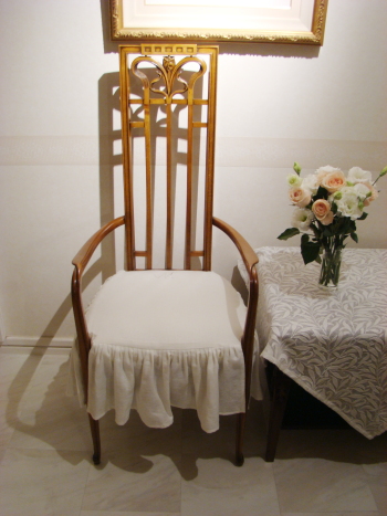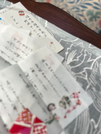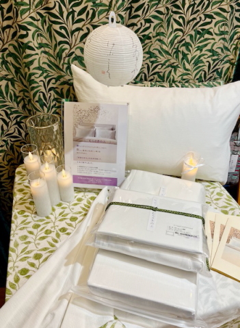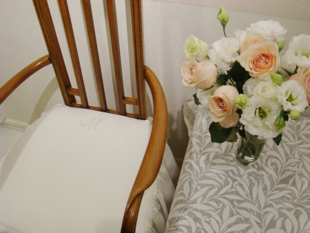 Room No.0176 2025年11月1日 (土) 「日々、エレガントに、麗しく、美しく」 T様へ 「お元気でいらっしゃいますか? 今日から11月、晩秋というのでしょうか? きっと、もっといい季節のご挨拶がありますでしょう。 T様から、丁重なお手紙を頂戴する度に、私たちスタッフは どきどきします。 まず、美しい切手が貼られた和紙の封筒、 凝った装丁の、時に扇子に書かれたお手紙などもあり、 さらに、便箋には達筆と表現するには失礼な程の、 あまりに美しい筆文字が感謝の言葉満載で 綴られているからです。 その1文字も間違えることなく、 さらさらと書かれた美しい文章を読む時、 いつも背筋が伸びる思いです。 こんな手紙を書かれる方に私たちの下手な文字でもって どうご返信したらいいものかと、毎回、途方に暮れます。 先日は、お客様である書道の先生が来店されましたので、 頂いたお手紙をお見せしましたら、 「う~ん、非の打ち所がない」とおっしゃいました。 ますます、『ご返事できなくなっております』と、 言い訳がましくこの場を借りて、お詫び申し上げます。 この夏、2度目となる、 ダイニングチエアのシートカバー6脚分を 製作させていただきましたが、 きっと、1回目の製作型紙は残っていないだろうからと、 先に、わざわざ現物のシートを見本としてお送り頂きましたが、 その丁寧な梱包と美しい包み紙、帯締めのような組紐に 驚きました。 実は、ステキな紐は新しいベッドリネン『むらさきの上』の ディスプレイに使わせて頂いております。 以前、お送り頂きました、かわいい提灯と一緒に。 そして、製作を経て、無事にお届けし、 うれしいご感想も頂きましたので、 ずうずうしくも、 「できれば、新しいシートクッションをセットされた お写真をいただけませんでしょうか?」と、お願いいたしました。 すると、 一緒に作成させていただきました センタークロス、ティッシュカバーが 紫色の花のアレンジと一緒に写真に納まっていました。 美しい風景ですね~。 ご夫婦のイニシャル刺繍入り シートカバーもバラのアレンジと一緒に 美しく端正な椅子の上に納まっていて、感動しました。 日々の美しい生活スタイルが あの美しいお手紙にそのまま表れているということですね。 お部屋のお写真を拝見させて頂き、納得いたしました。 もう、20年近い、長いお付き合いをいただく中で、 メールだけのやり取りで、ベッドルームのコーディネート、 いろんなお部屋のカーテン、こんなシートクッションや 雑貨に至るまで様々、製作させて頂き、 そして、その度、喜んで下さり、 今、振り返ってもうれしさでいっぱいになります。 そして、そのプロセスが全部、楽しいです。 メール、毛筆のお手紙、お部屋のお写真から偲ばれる、 ”日々をエレガントに、麗しく、美しく”という T様の美意識からたくさんのことを学ばせて頂いております。 これからも、ステキな暮らし方のエッセンスを 私たちにもそっと、おすそ分け下さいますように。 心よりの感謝を込めて」